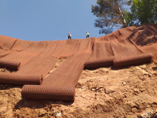 Errichtung eines Steinschlagschutzdammes aus Bewehrter Erde